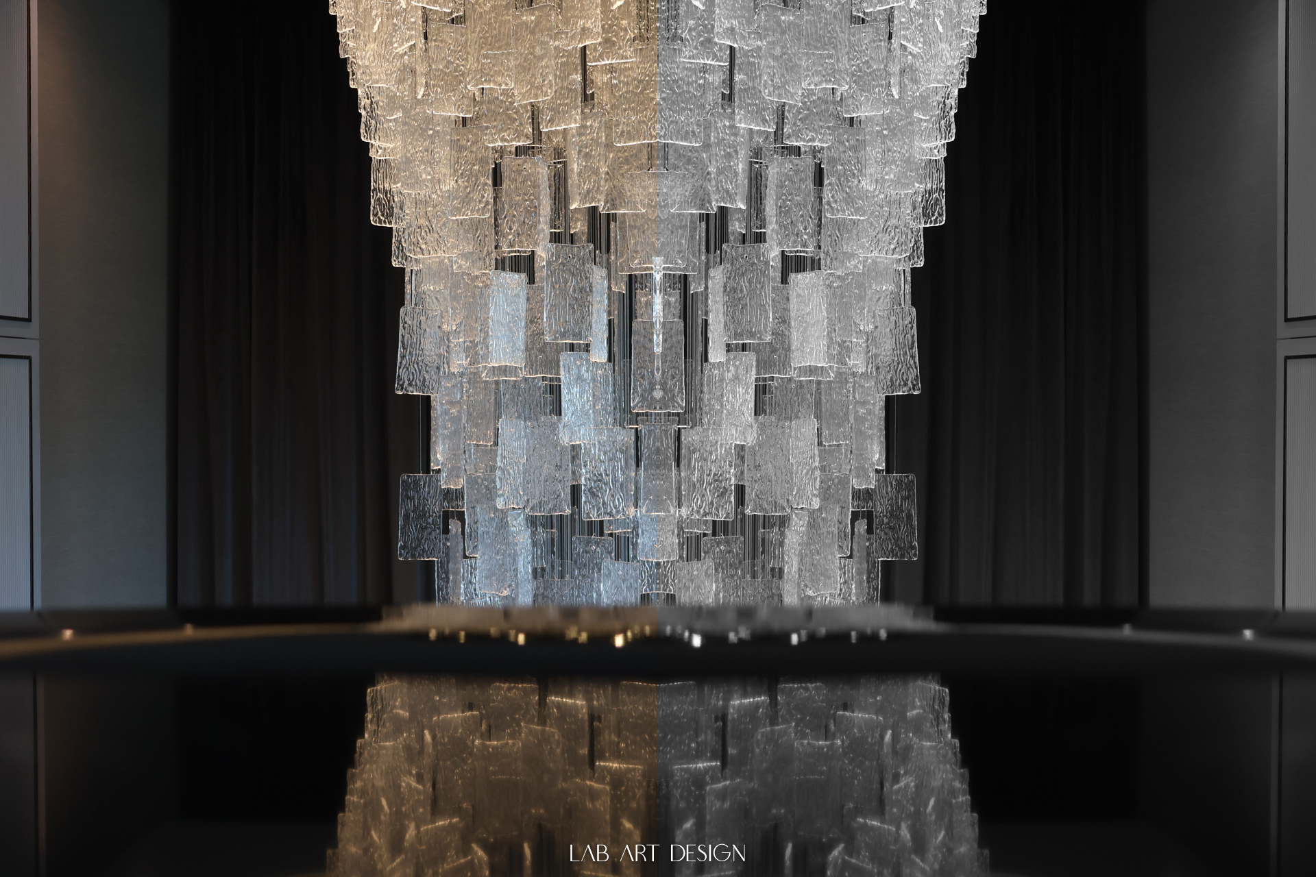ชมผลงานกันต่อสำหรับ Project Grand Bangkok Boulevard Chaengwattana-Ratchaphruek ตัวงานเป็นแก้วหนาพิเศษหล่อโดยใช้ความร้อนสูงหลอมแก้ว มีการนำวัสดุหลอมเหลวเทลงในแม่พิมพ์เมื่อเย็นตัวลงจึงค่อยกะเทาะแม่พิมพ์ออก โดยลักษณ์แบบพิมพ์ให้ความรู้สึกราวกับว่าเป็นผลึกน้ำแข็ง เมื่อรวมกันหลายร้อยชิ้น จึงเหมือนธารน้ำแข็งขนาดใหญ่ย้อยลงมาบนพื้นที่สุดพิเศษของคุณ
