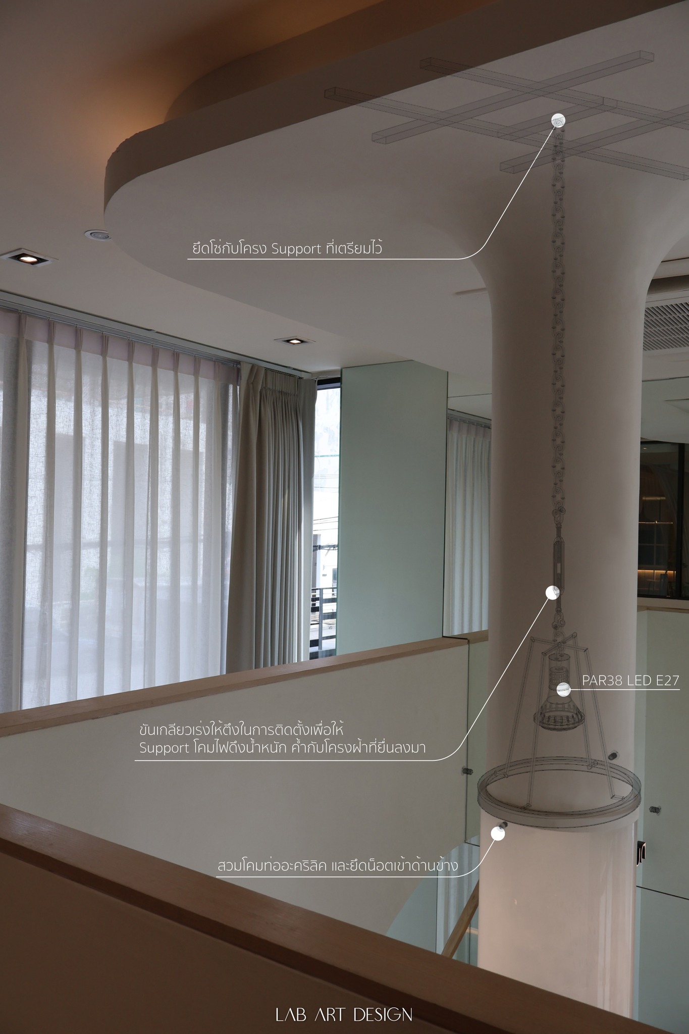 𝗛𝗮𝗻𝗴𝗶𝗻𝗴 𝗮𝗰𝗿𝘆𝗹𝗶𝗰 𝘁𝘂𝗯𝗲 โคมไฟอะคริลิคขนาดใหญ่ด้วยขนาด Dia 30 cm ทำให้ตัวโคมมีน้ำหนักค่อนข้างสูง ทางเราจึงมีการวางแผนในการติดตั้งอย่างรอบคอบ ควบคู่ไปกับการออกแบบขายึดโดยคำนึงถึงลักษณะแสงที่ได้และองศาที่ไม่ให้เกิดการตกกระทบของแสงเงา มีการทดลองด้วยหลอดไฟหลายชนิดเพื่อให้แสงออกมาสวยงามลงตัวสำหรับ โคมไฟที่มีขนาดใหญ่นี้