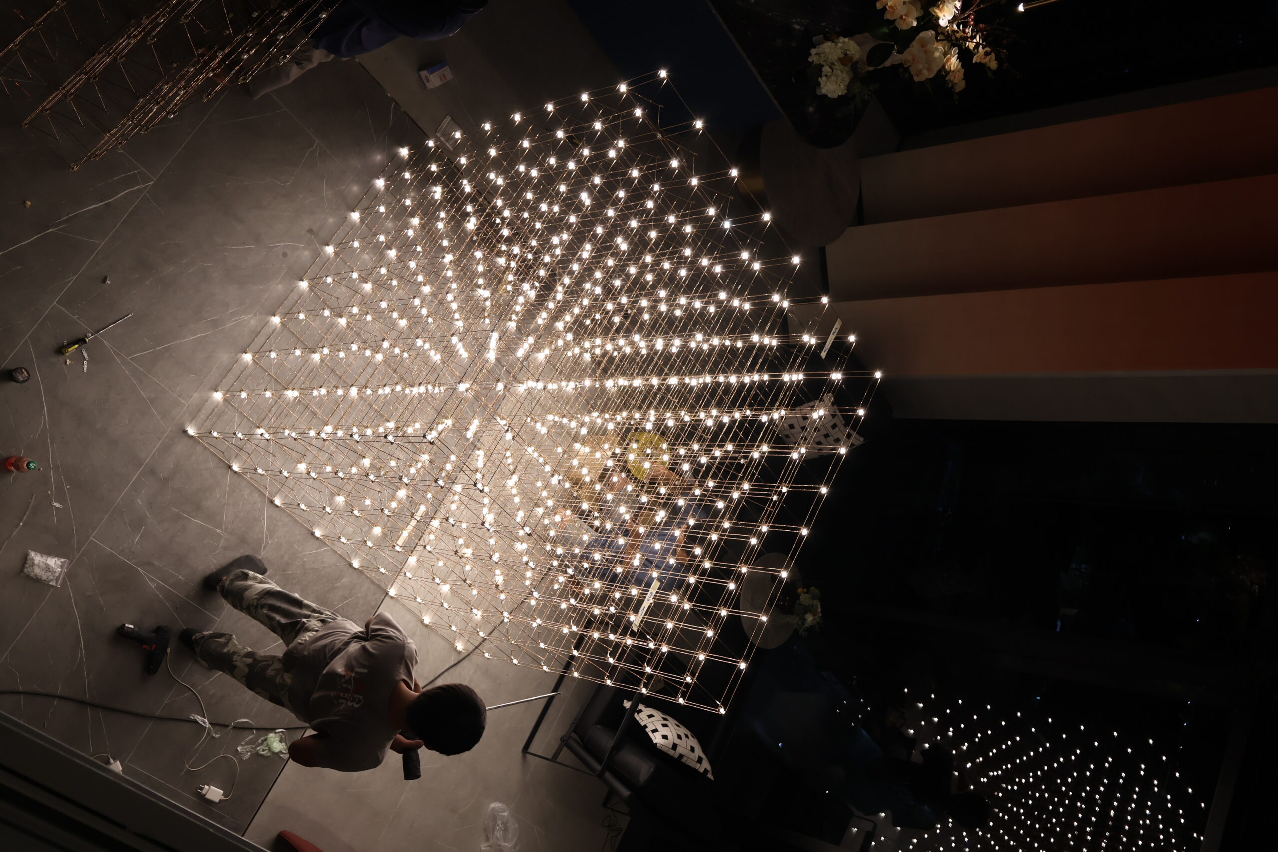โคมไฟสั่งทำใน Sky Lounge ทำหน้าที่เป็นทั้งแสงสว่างและงานศิลป์ แสงที่จัดวางอย่างประณีตช่วยสร้างความผ่อนคลายและความรู้สึกพิเศษ เหมาะกับการพักผ่อน พบปะ และชมวิว