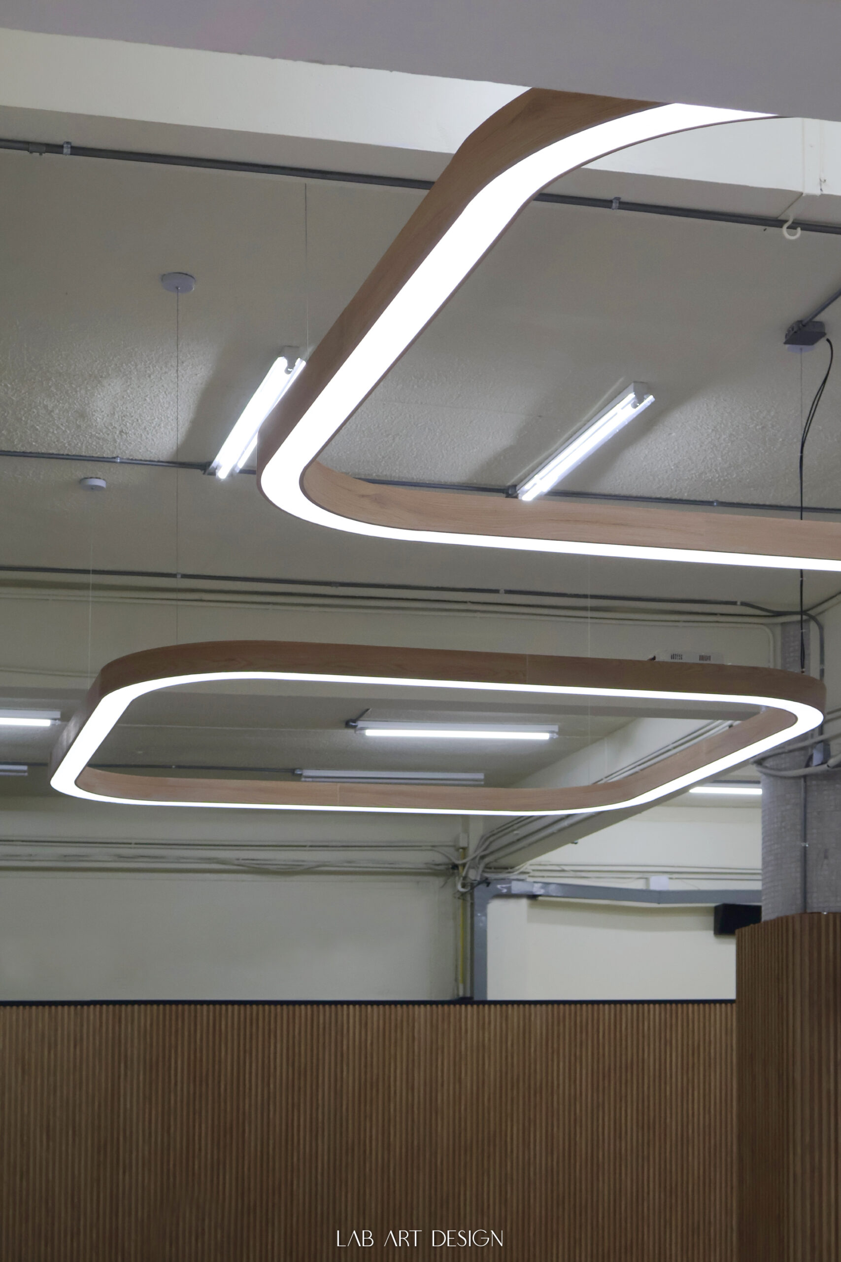 An oversized lighting installation spanning over 15 meters, finished with laminate surfaces. Serving both as decorative and functional lighting, the fixture enhances the atmosphere and seamlessly blends into the space.